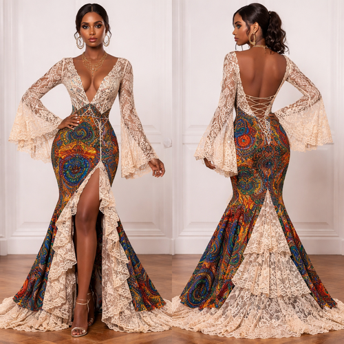I to create an evening dinner dress that unique and elegant that is made from African lace fabric and mixed with beautif...