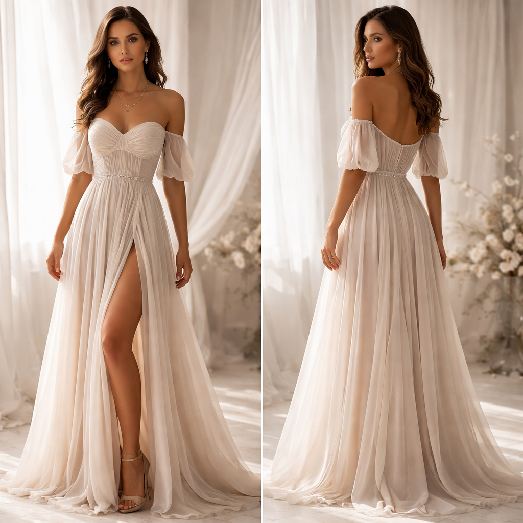 Maxi dress off the shoulder. Pulls under the bust. Ethereal , glamorous style, show front and back