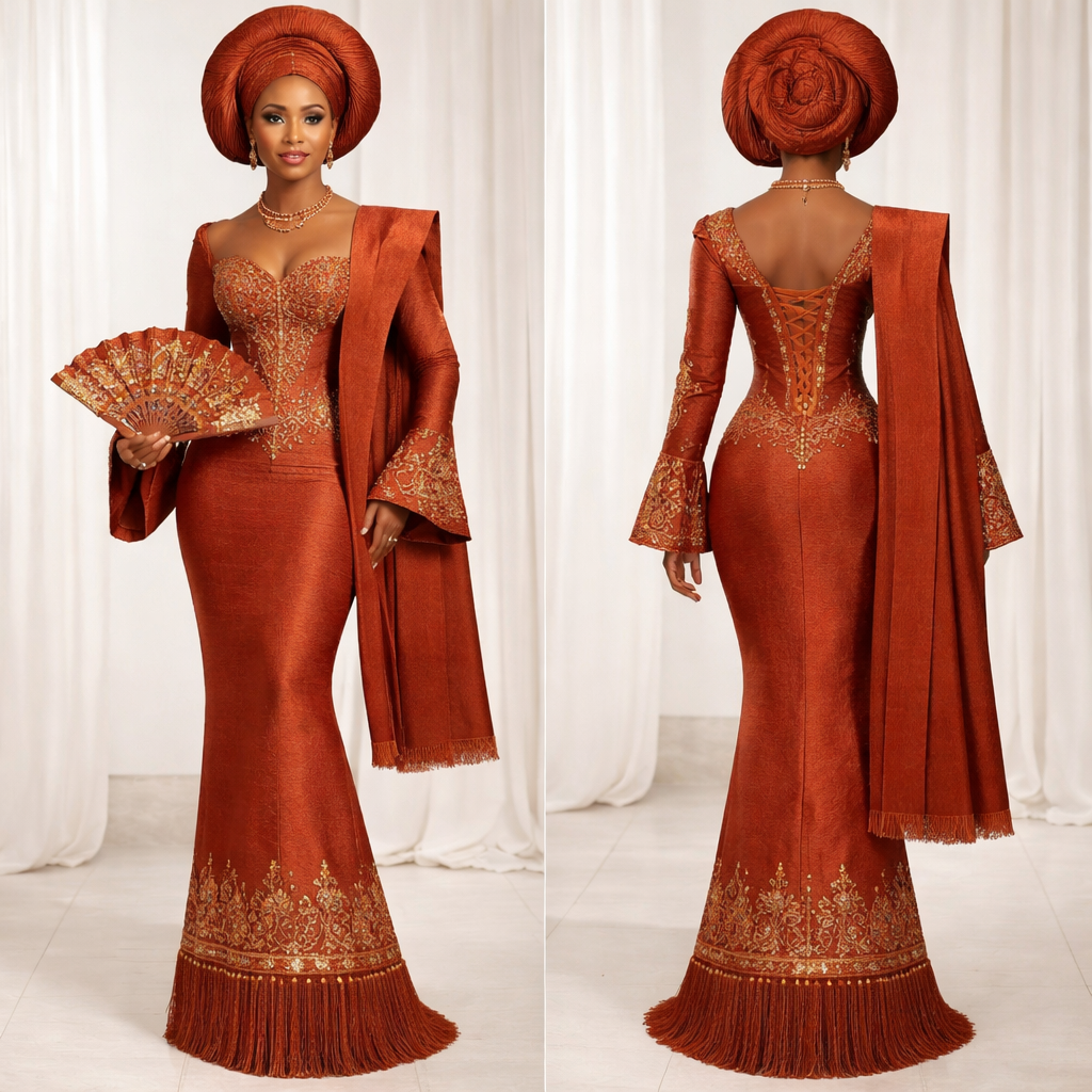 Overall Concept Traditional Yoruba bridal gown in burnt■orange aso■oke, designed to feel regal, ceremonial, and highly structured. The look should be intentional and architectural, balancing rich embellishment with a refined, elongated silhouette. Silhouette • Fitted, floor■length gown with a clean, elongated line • Gradual tapering toward the hem (slightly slimmer as the dress approaches the bottom) • No flare or mermaid shape — controlled, elegant narrowing • Front and back must feel equally finished Fabric • Nigerian aso■oke • Subtle ceremonial sheen — woven, rich, not glossy or metallic • Fabric should hold structure and appear substantial Bodice & Neckline • Soft sweetheart or curved neckline • Fine floral embroidery at neckline and natural waist (do not remove) • Back features clean lace■up corset closure with light floral framing Sleeves • Long sleeves with pronounced flared cuffs • Flare is ceremonial but controlled — no softness or ruffles Hem Embellishment & Fringe • Floral embroidery band positioned just above the hem • Moderate density — refined, airy, evenly spaced • Florals visually connect directly into the fringe • Full fringe trim at hem in matching aso■oke, medium to long length Ipele (Sash) • Structured, single■layer ipele made from the same aso■oke as the dress • Very stiff and architectural — no drape or flow • Clean edges, ceremonial presence • Anchored firmly at the shoulder in traditional Yoruba bridal style Bridal Fan • Hand fan constructed from the same aso■oke fabric • Structured and ceremonial, not soft • Light floral detailing to coordinate with dress embroidery Overall Direction Traditional Yoruba bridal • regal • structured • intentional • balanced embellishment. Nothing soft, accidental, or overly Do not add any flare shape to the bottom. Make it like a pencil skirt structure that gets smaller as it gets to the bottom. Add fringes to the bottom and do not make it off the shoulder. Make the designs floral and make the sash structured and still and with no layers. , cultural style, show front and back
