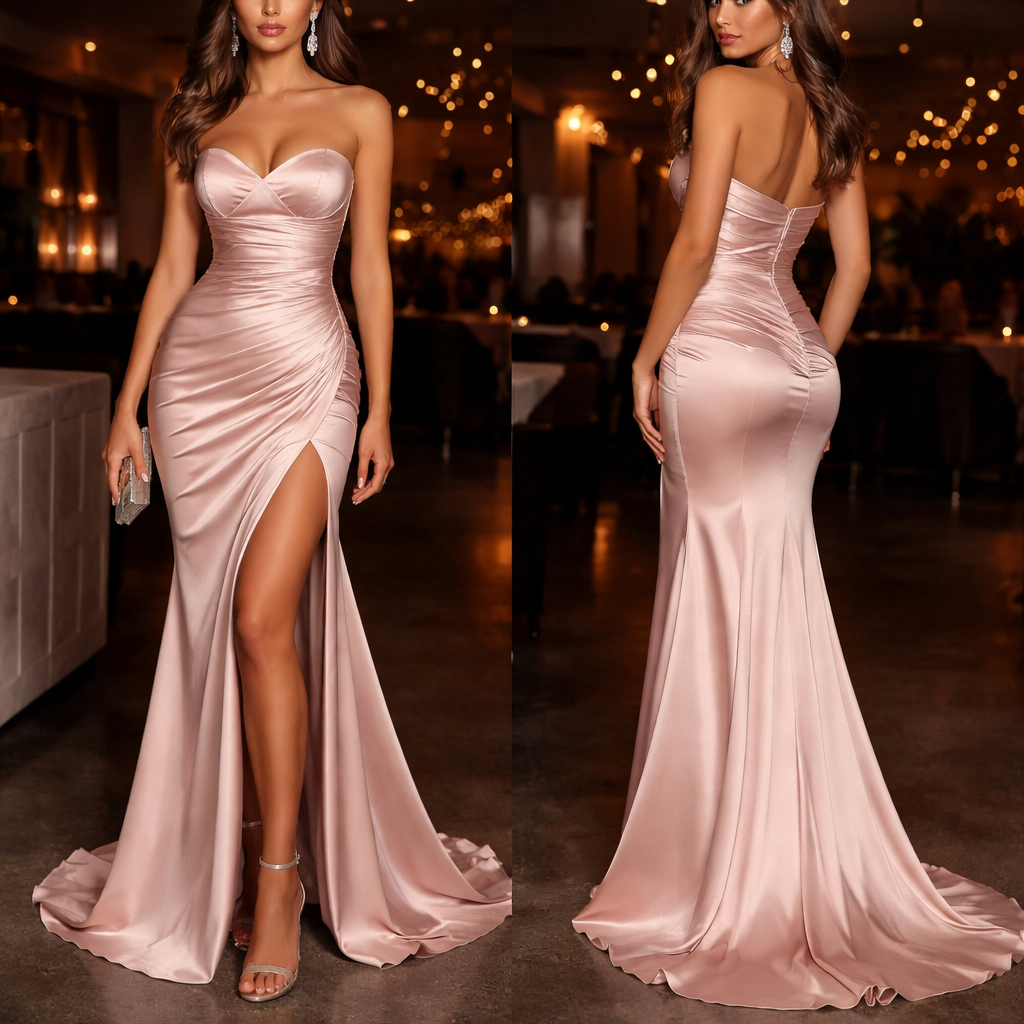 The dress is a soft blush pink satin evening gown with a very elegant and sophisticated design. The color is a light pastel pink, sometimes described as blush pink or dusty rose, which gives the dress a delicate and romantic appearance. The satin fabric has a smooth and shiny surface, reflecting light softly and creating a luxurious glow. The gown features a strapless bodice with a sweetheart neckline. The neckline curves gently across the bust, forming a soft heart-like shape that highlights the chest and collarbone. This style gives the upper part of the dress a feminine and elegant look while keeping the shoulders and upper chest exposed. The bodice and stomach area of the dress are designed with horizontal and slightly diagonal ruching. This means the fabric is gathered into soft folds and pleats that run across the torso. These folds wrap gently around the waist and stomach area, creating texture and adding visual interest to the design. This ruching also serves a shaping effect. The gathered fabric helps contour the waist and stomach, making the silhouette look more flattering and sculpted. Instead of straight seams like a corset, the dress uses soft draped folds to shape the body and create a smooth transition from the bust down to the hips. The fabric around the waist appears slightly gathered toward one side, forming diagonal pleats that wrap across the front of the dress. This creates a subtle asymmetrical design that adds elegance and movement to the gown. From the hips downward, the dress continues into a long, fitted skirt that follows the shape of the body. The skirt hugs the hips and thighs before extending into a smooth, floor-length silhouette. On one side of the skirt, there is a high slit that begins around the upper thigh. This slit allows the leg to be visible while walking and adds a dramatic, glamorous touch to the design. It also helps the wearer move more comfortably despite the fitted shape of the gown. Toward the bottom, the satin fabric falls smoothly toward the floor, creating a sleek and elegant line. The soft pink color and glossy satin texture give the dress a romantic and luxurious appearance. Overall, the dress combines several refined design elements: a sweetheart strapless neckline, soft satin fabric, ruched folds across the stomach and waist, a fitted silhouette, and a high thigh slit. These details create a graceful and glamorous evening gown, perfect for proms, formal events, galas, or elegant celebrations. , nightclub style, show front and back