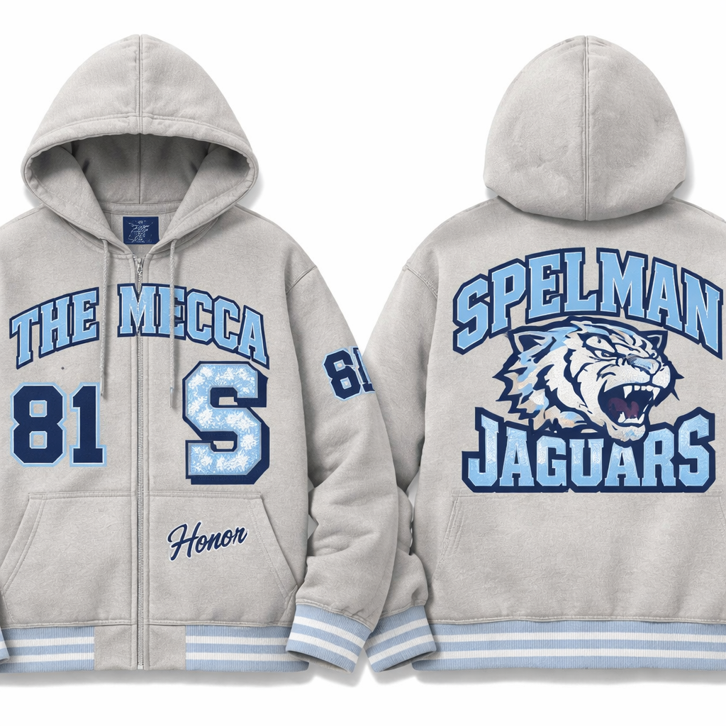 Design a new hoodie like the one on this page https://www.dtlr.com/products/for-the-fan-howard-university-the-mecca-honor-full-zip-fleece-hoodie-ma-navy-how-1867-301-2a-nay Switch out 67 for 81, add the S patch for Spelman design a new hoodie using the following details remove the H patch, change the strings on the hoodie to baby blue and the sweatshirt to a grey color and on the back add the spelman jaguars logo as the previous style , streetwear style, show front and back