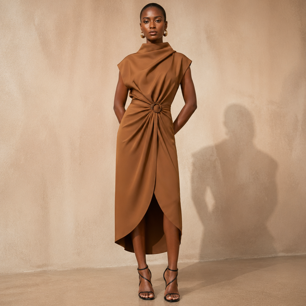 A Female Dress design, suitable for Fall. South Africa fashion aesthetics.
