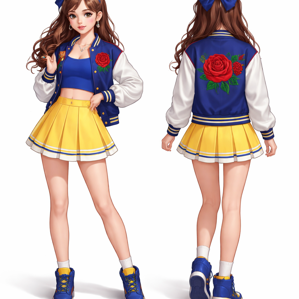 A 16 year old teenage girl with a European face and brown hair with a Bow wears royal blue top and a jacket with a red Rose on it and a yellow skirt and royal blue sneakers , varsity style, show front and back