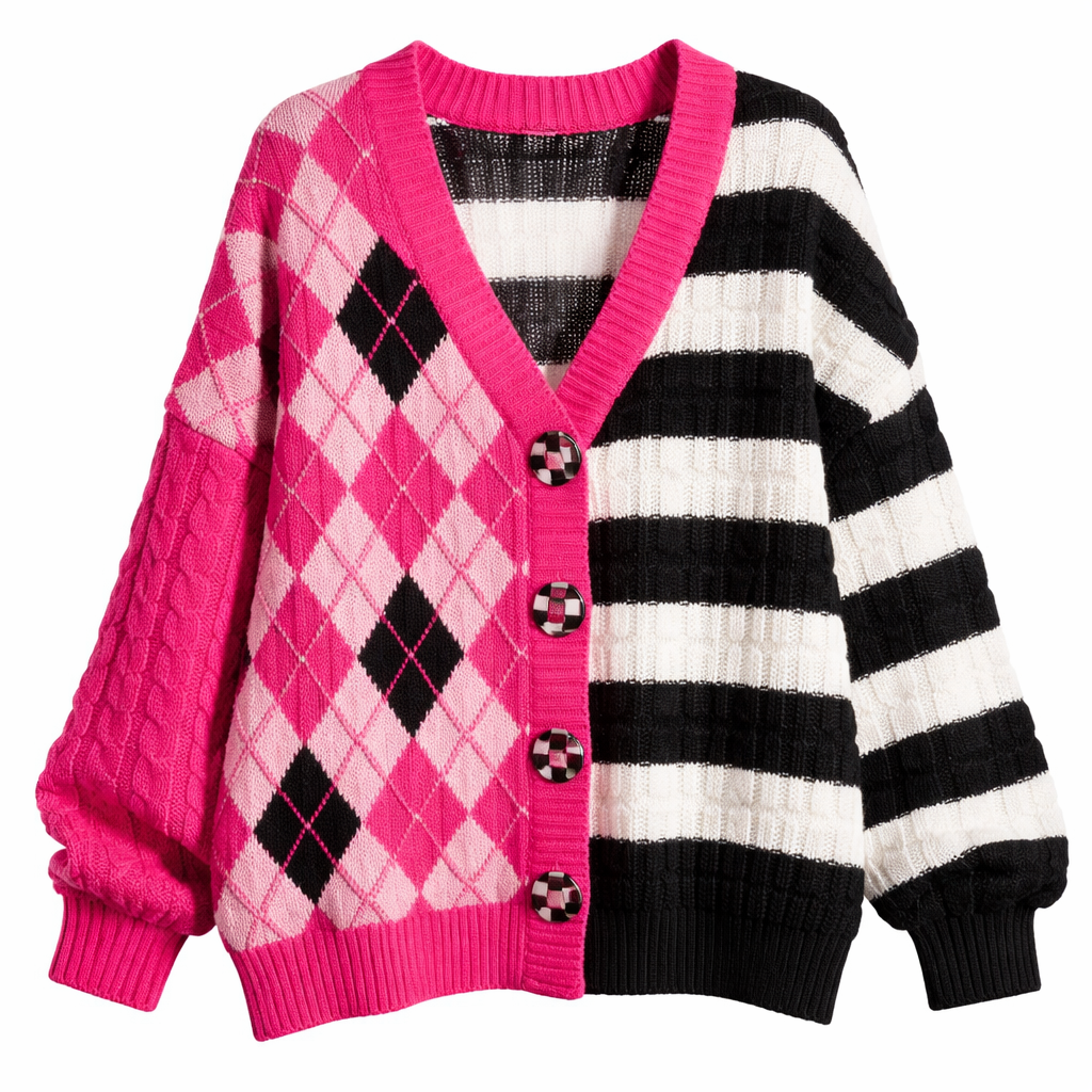 Eighties fashion design: **A vibrant eighties-inspired cable-knit cardigan featuring a hot pink and light pink argyle pattern on one side, and bold black and white broad stripes on the other. It has prominent black and hot pink checkered buttons, a slouchy fit, and dropped shoulders.**
