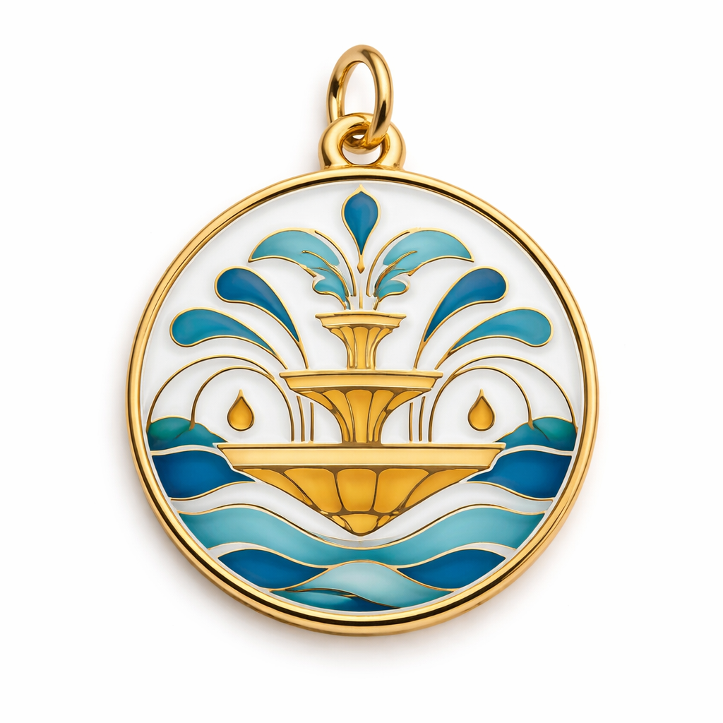 Make an enamel charm for a bracelet. It needs to be inspired by Kansas City being the city of fountains. No words. Keep it super simple. Let’s have it be geometric with just water , classic style