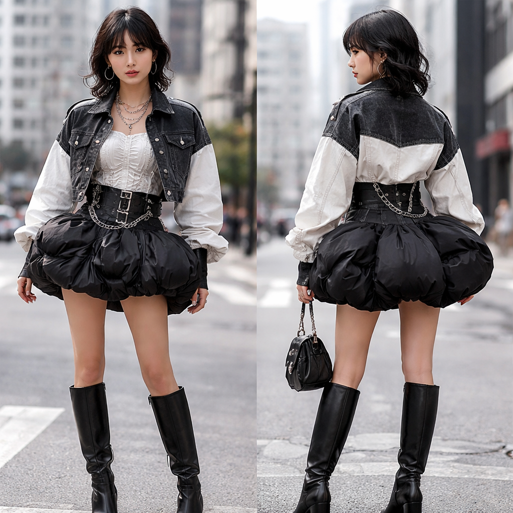 Real clothes, street clothes, modern, with puffy vintage bustle, monochrome style, show front and back
