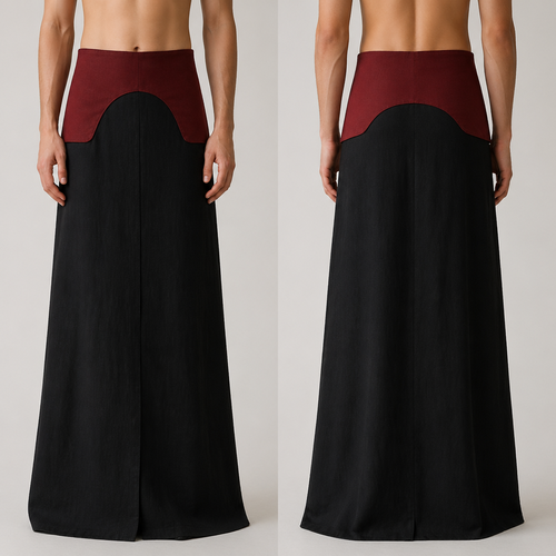 A Male Skirt design, suitable for Spring. can you make the skirt on this a full length and the cutout above shape make t...