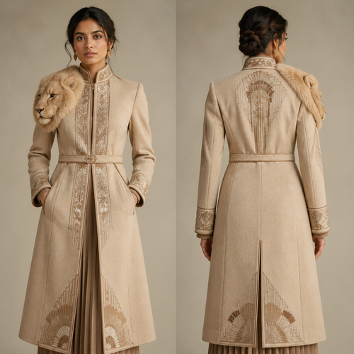 A Female Coat design, made of Wool, for Casual, suitable for Winter, in Indian + Art Deco + Active style. lion fluffy, b...