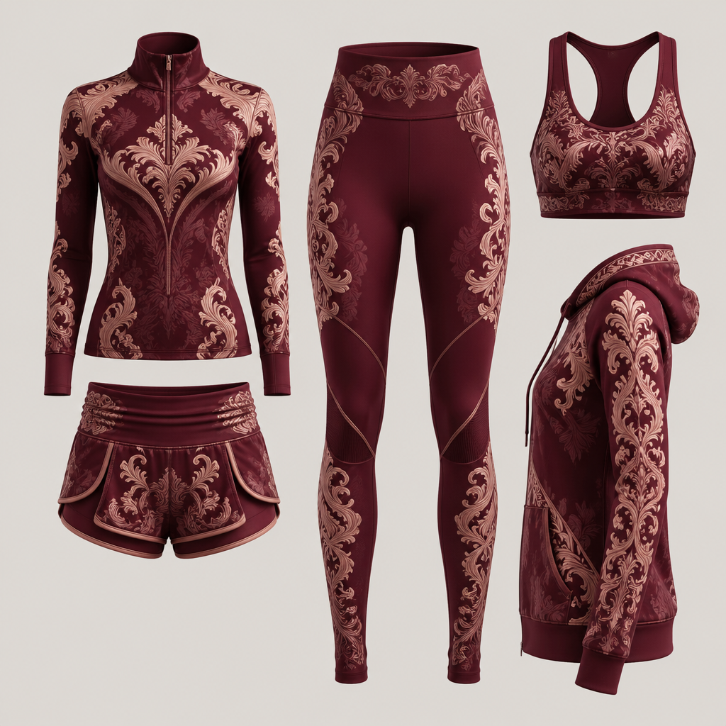 photorealistic fashion design, A Female Activewear design, suitable for Spring, in Baroque style. comfy, sporty, wine red. Czech Republic fashion aesthetics., baroque style, just the design no text