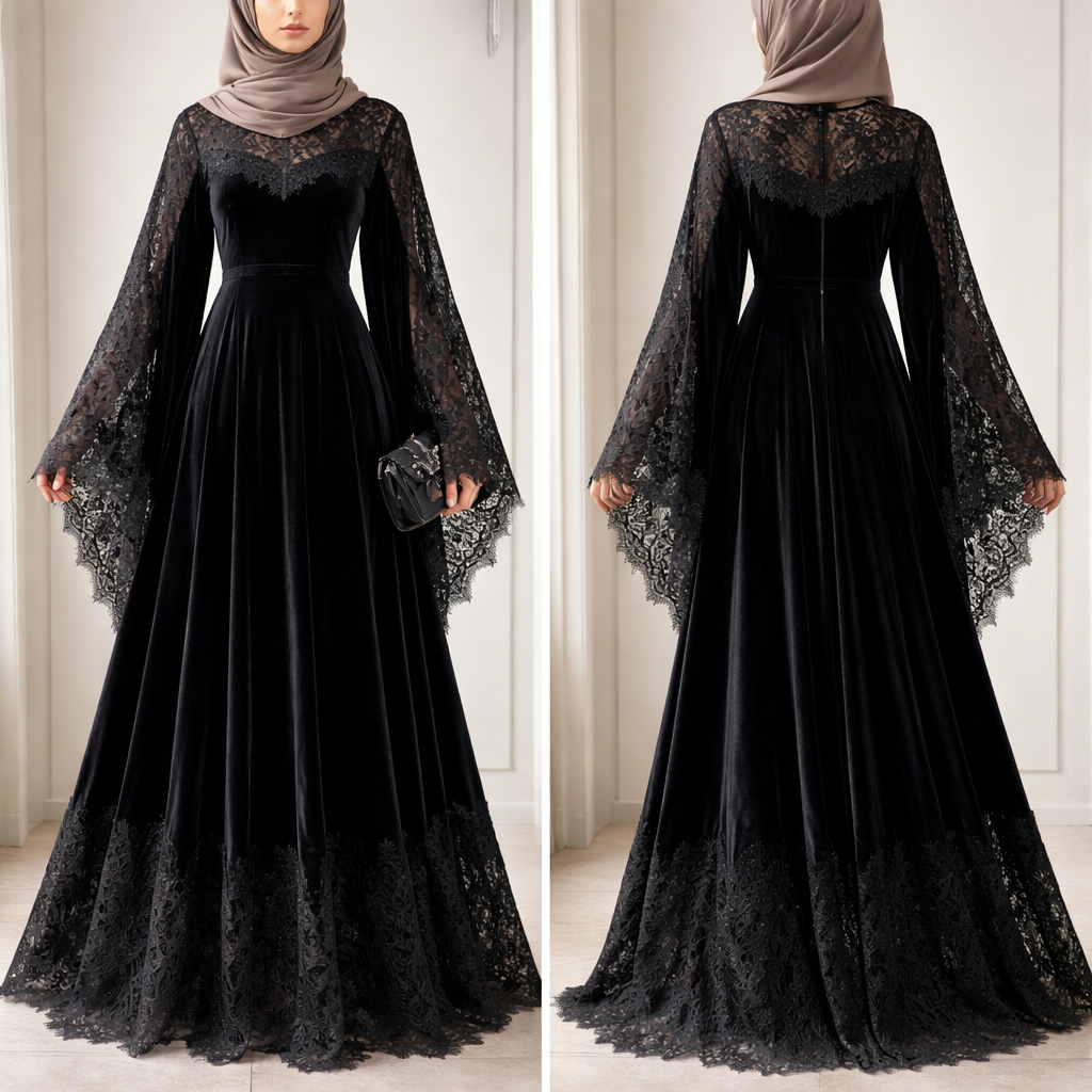 Придумай платье из бархата длина макси и рукава макси,силуэт трапеция ,с добавлением кружева ,талию сделай свободной(платье для хиджаба), show front and back