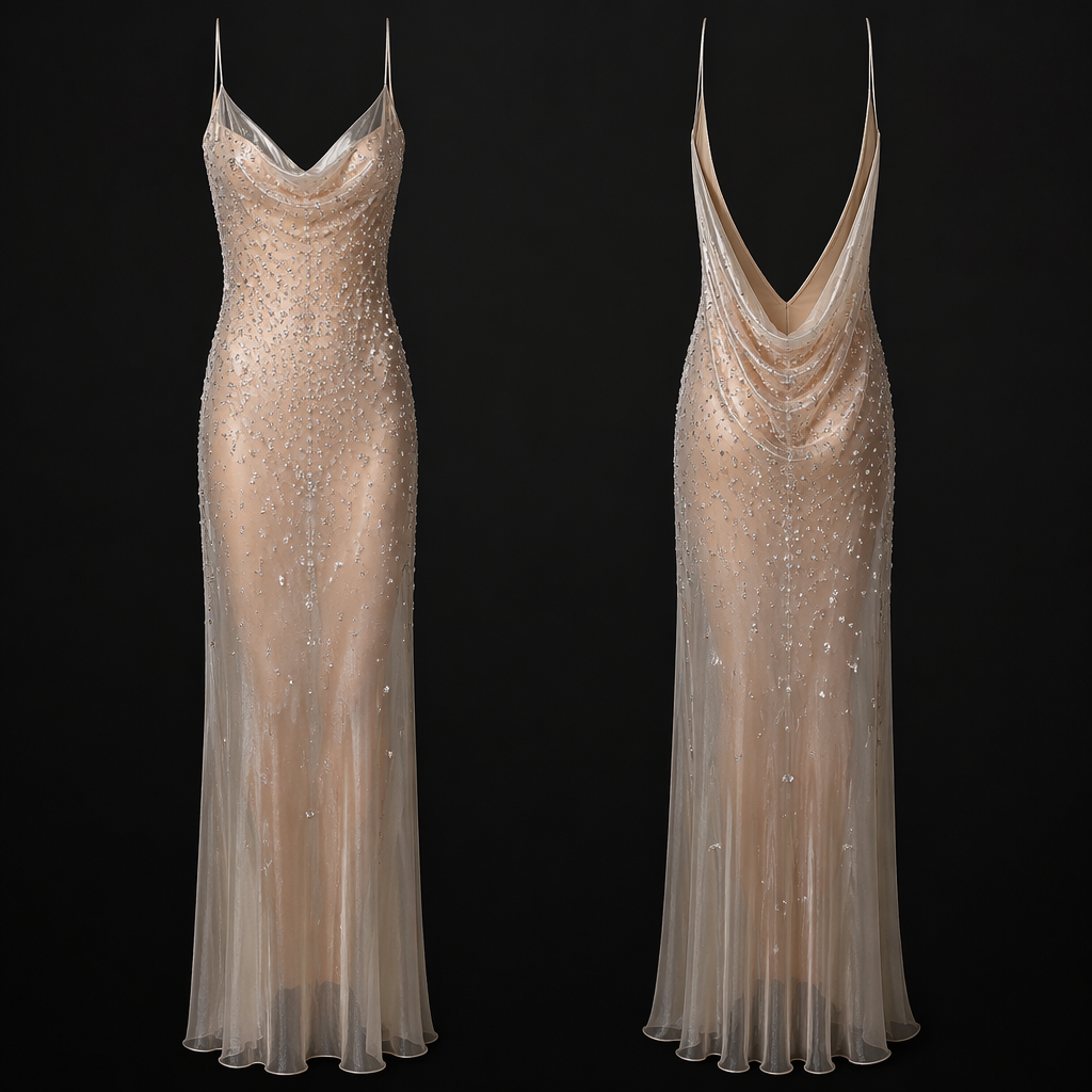 photorealistic fashion design, Crystal Veil Slip Dress An ultra-light, barely-there silhouette crafted from sheer silk layered over a nude base. The dress is adorned with delicate, hand-placed crystals that scatter across the body like light reflections. Thin straps, a soft draped neckline, and a fluid shape give it a sensual, effortless luxury. It’s modern glamour with a whisper, not a shout., just the design no text, show front and back