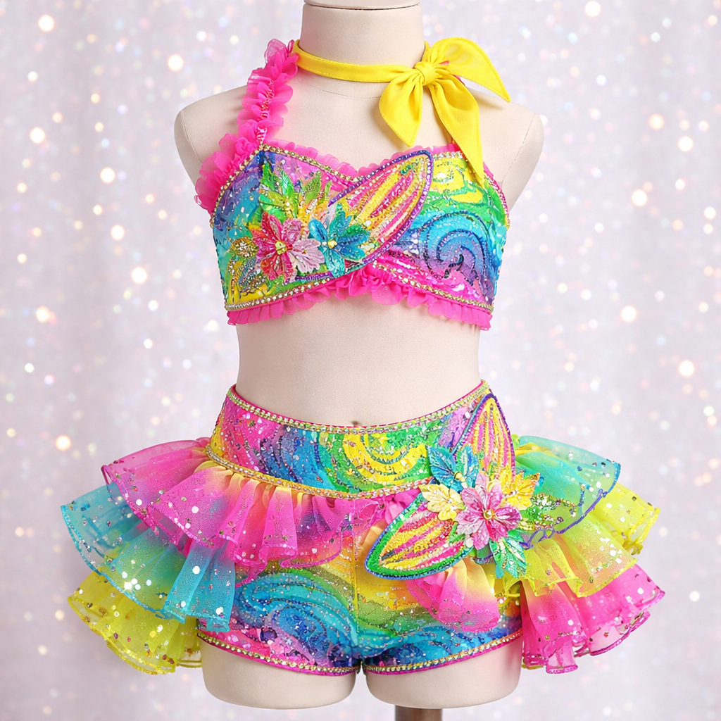 Design a two piece dance costume for 6-7 years jazz dance competition solo to song “surf crazy” . Must be in neon colours with glitter and sequins and include a sequin appliqué detail. Age-appropriate with some sparkle and bling that will look good on stage. An original creative design that will impress judges