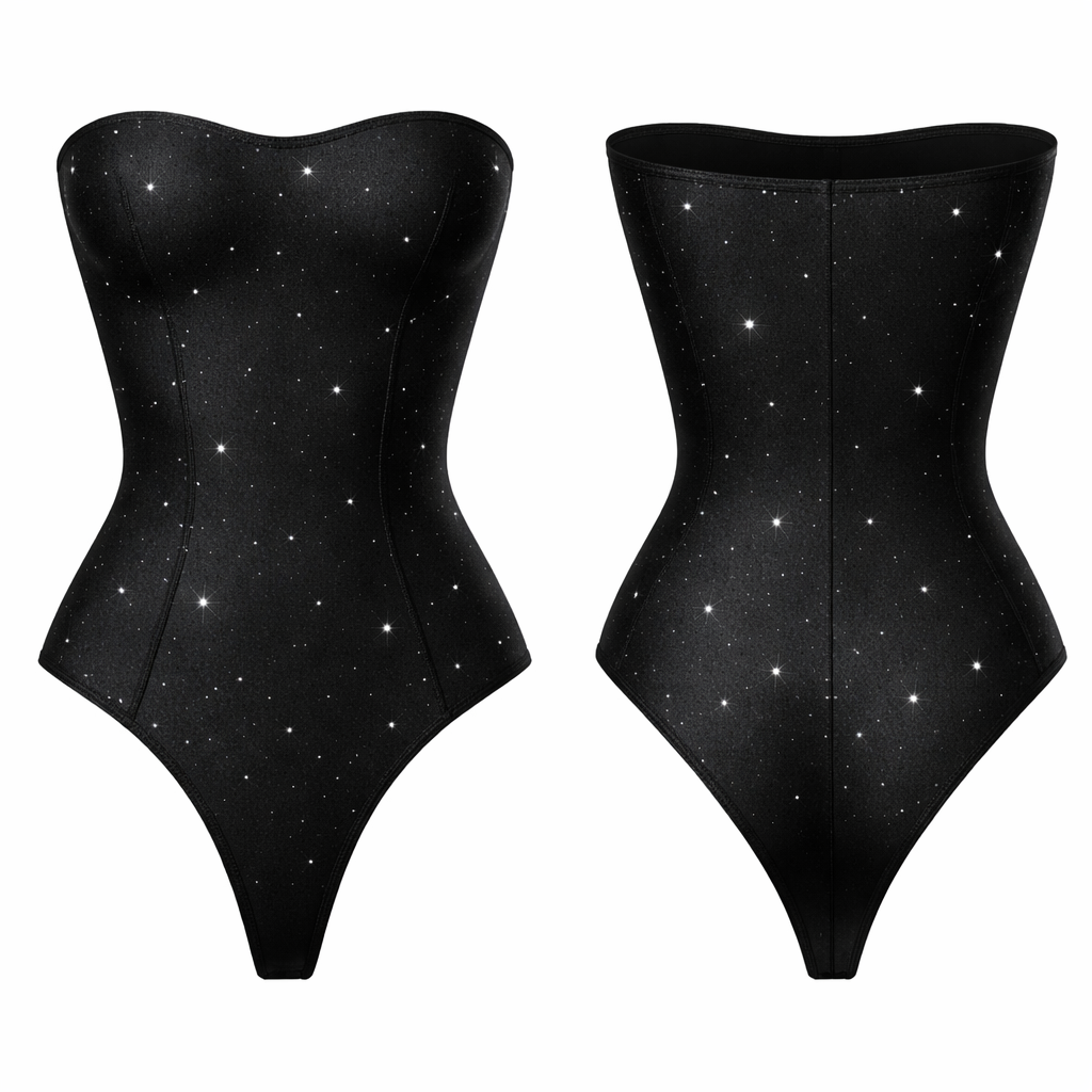 Bodysuit shape wear g string no ai model strapless no lines just no bow just string and no back open no ruffles black with white stars glitter stars little