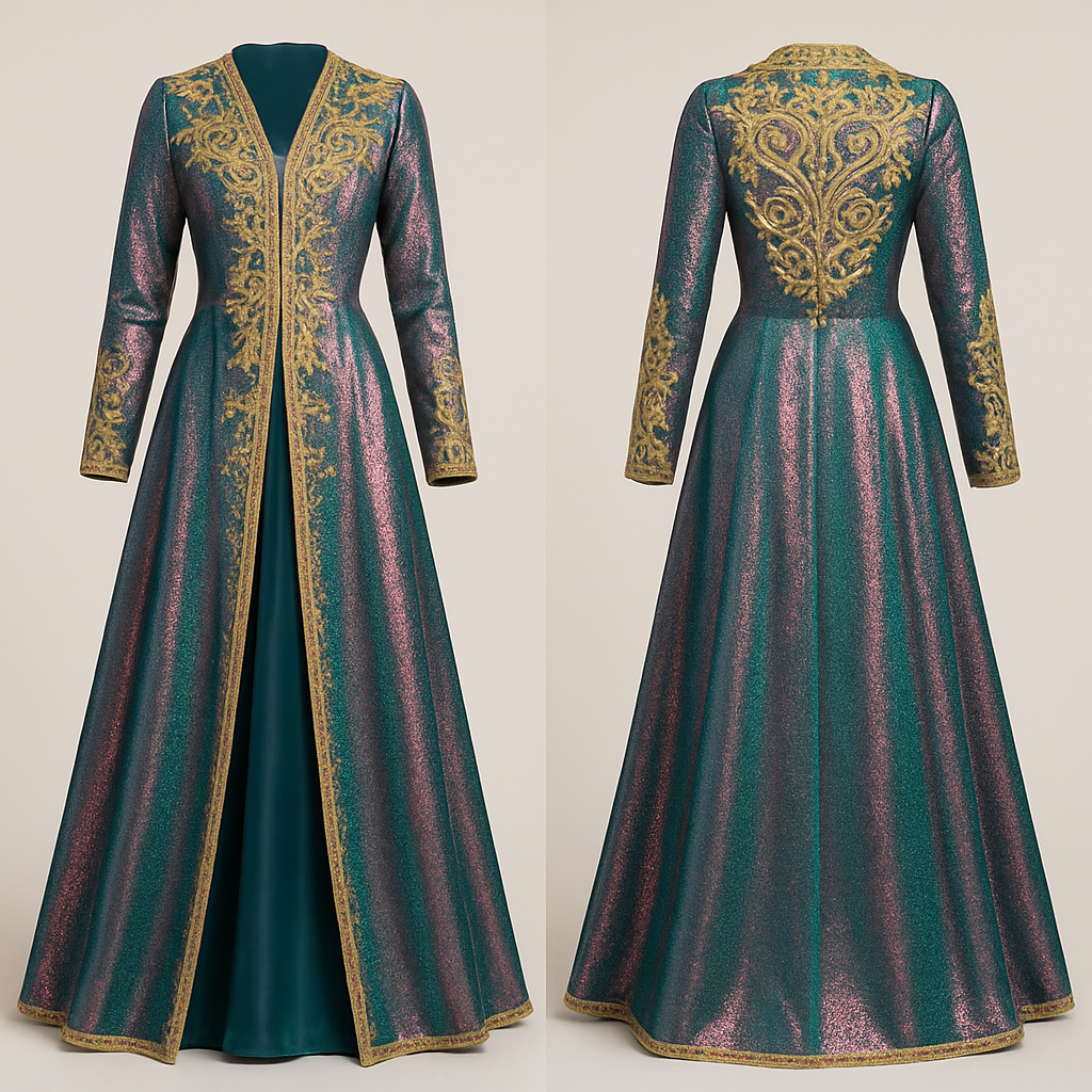 Create a takshita in petrol/pink lamé fabric that shimmers. Sfifa and zwaq maalam should be gold. Sleeves should be long. Sleeves also should have zwaq maalam. The under dress should be showing in petrol satin fabric. The zwaq maalam design should be fuller in de upper side (chest), glamorous style, show front and back