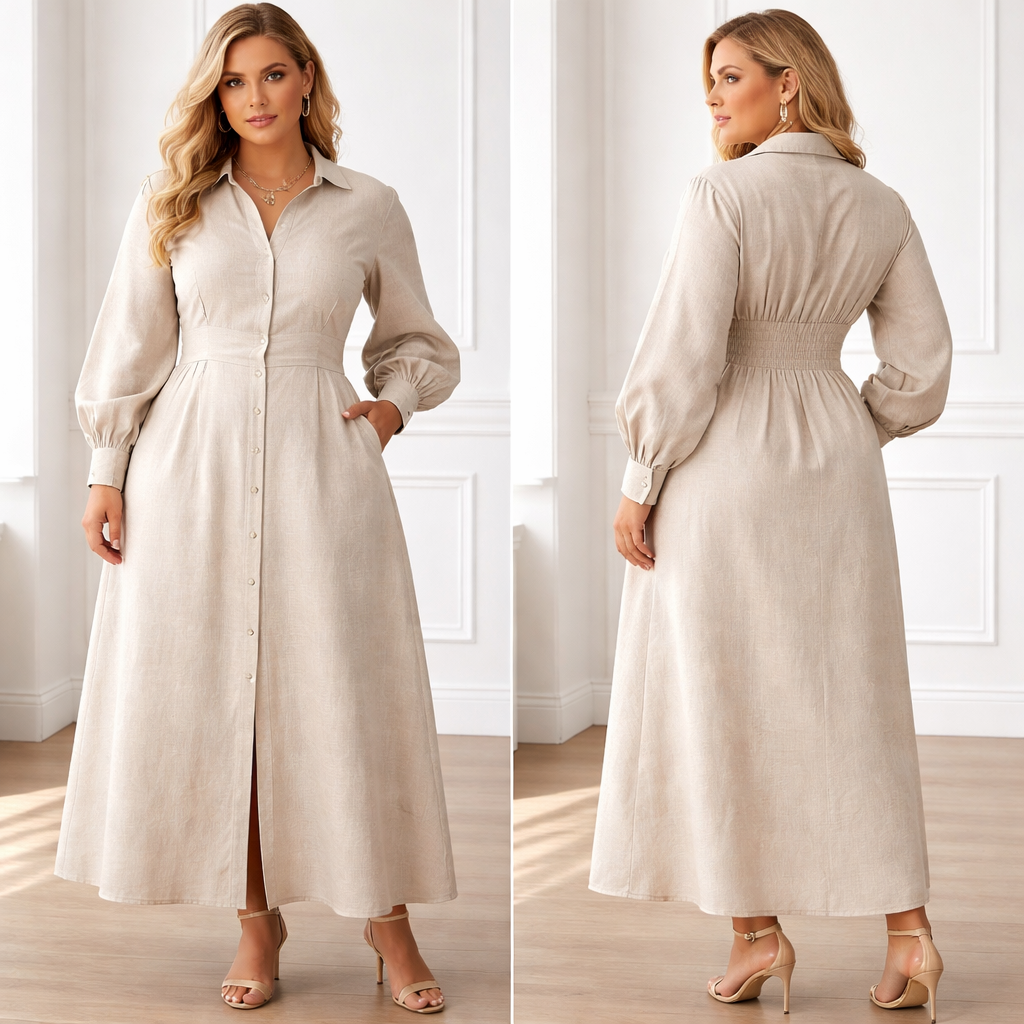 A fitted shirt dress by the waist with a band at the back made with linen and has pockets. The sleeves are long but a bit puffed up because the sleeves are banded around the wrist. So it’s adjustable. Do it in a white beige color. The dress should be long like ankle length. The band should be at the back and make the sleeves more puffed and the model should be a little curvier. So the top should be slightly more fitted and the bottom loosen