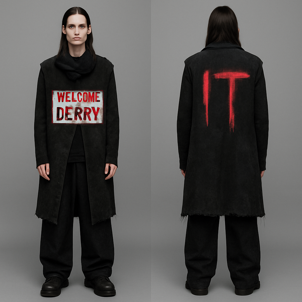 I wanna make a collection inspired by Welcome to Derry. Could you imagine what it would look like if Rick Owens made an collection inspired by Welcome to Derry Ex, show front and back