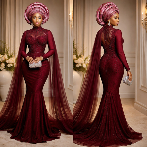 A maroon long sleeve dinner gown with a light pink and stripes of maroon aso eko head gele and a maroon net veil on the ...