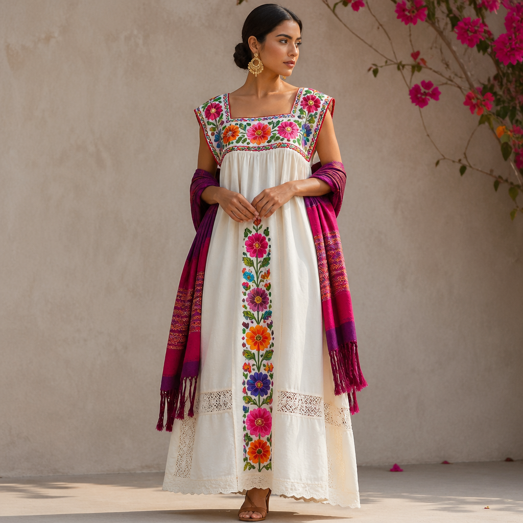 A Female Dress design, suitable for Spring. Consider Mexican fashion — huipil and rebozo traditions, vibrant embroidery,...