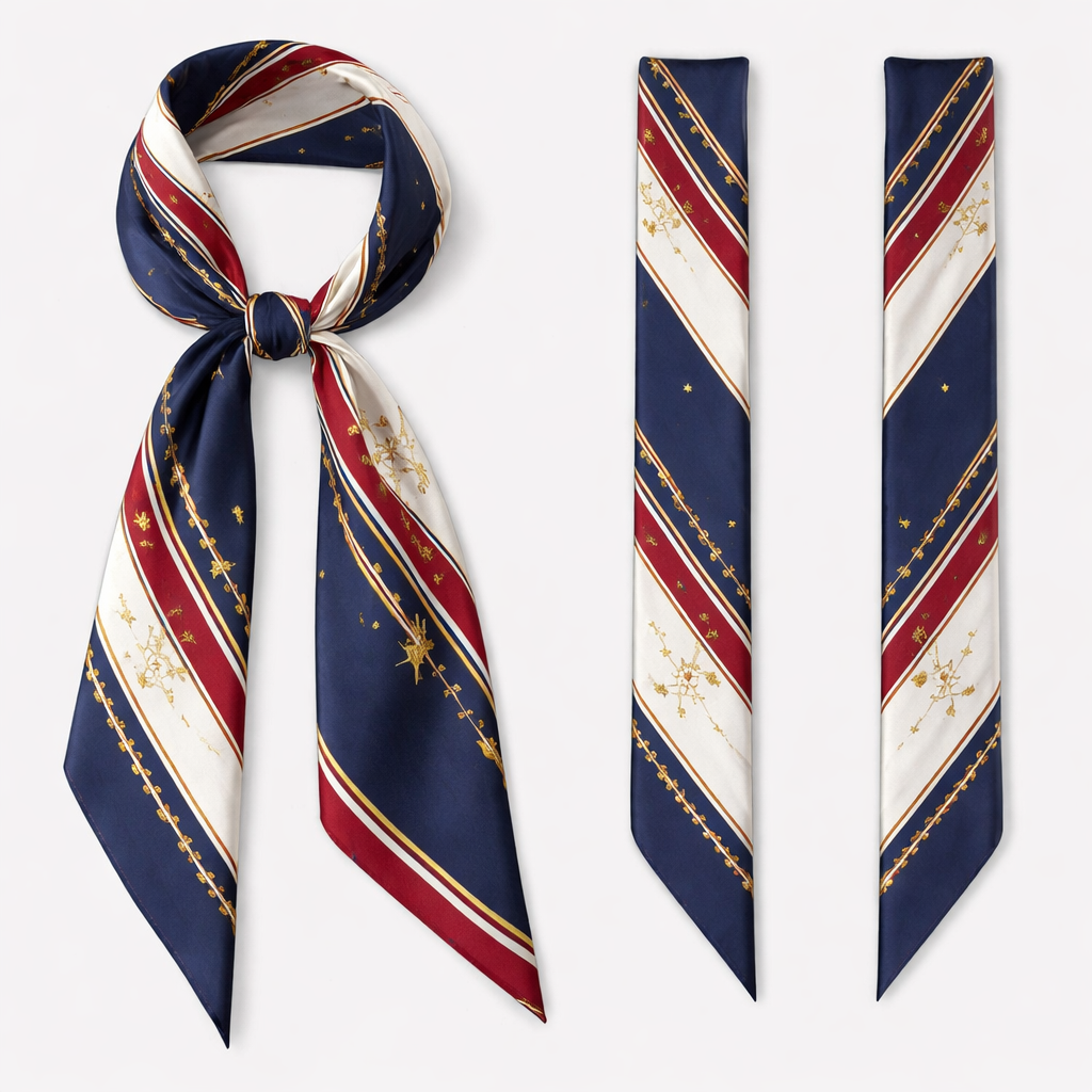 Design a silk twilly scarf that is 5x 86cm that is for the United States of America’s 250th birthday. No words or logos. Dior style. Way more simple and more tailored