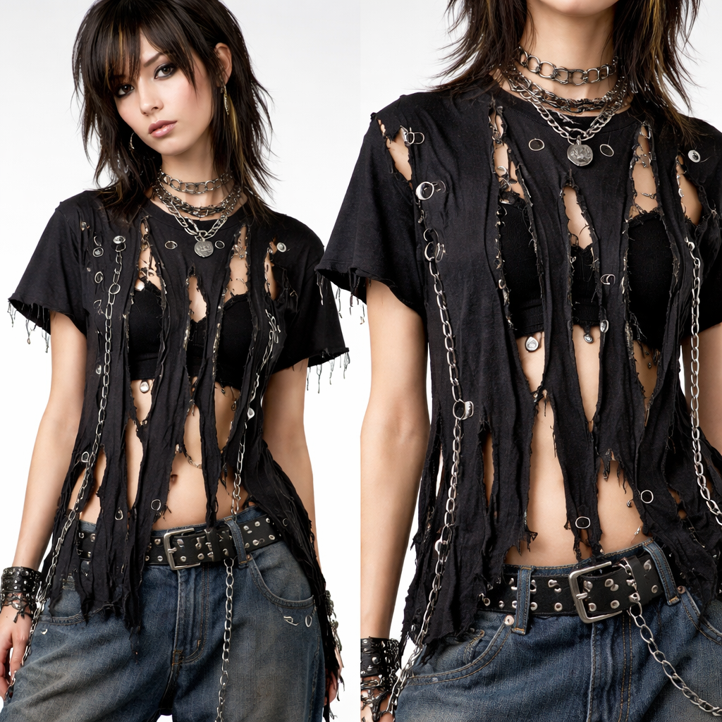 I want a distressed black shirt that is vertically cut I want it to be a mix of 90s hip and 90s emo "