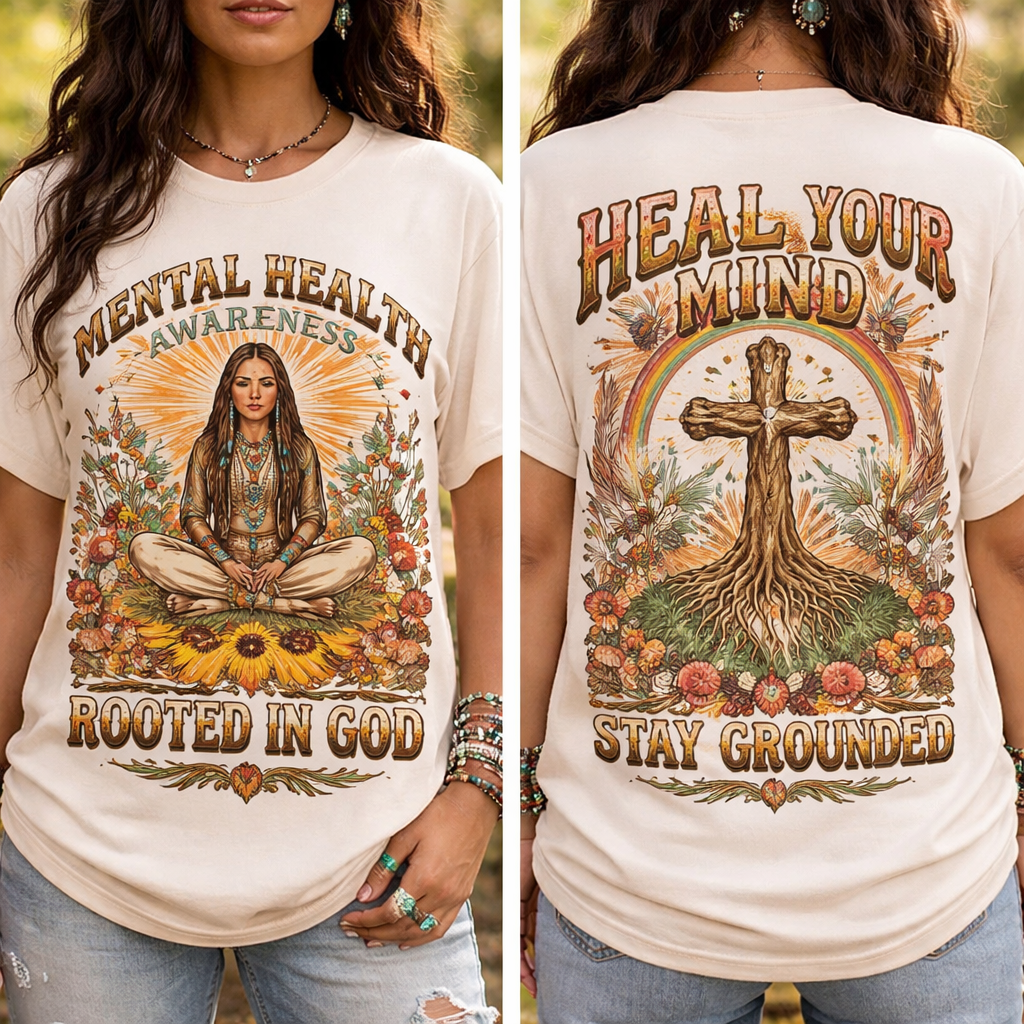 Mental health awareness, rooted in God, indigenous, vintage style, show front and back