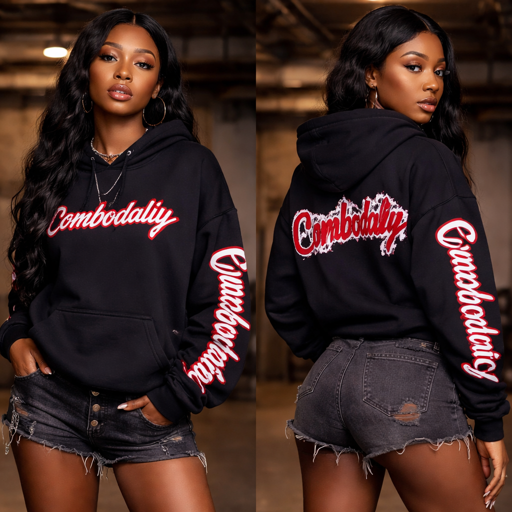 Combodaily branded on back hoodie sleeves on a black girl model in a basement environment , streetwear style, show front and back