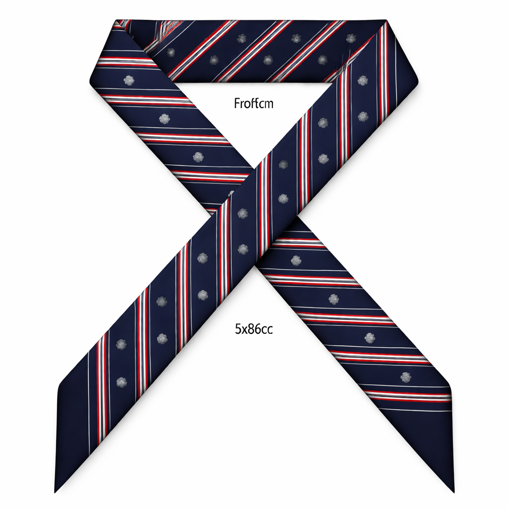 Silk twilly scarf 5x86cm, Kelly bag wrap style, J. Press preppy, deep navy base, thin diagonal white stripes with thinner red stripes, subtle tiny gray abstract soccer balls, minimalist, symmetrical, elegant, clean, no logos or text., show front and back
