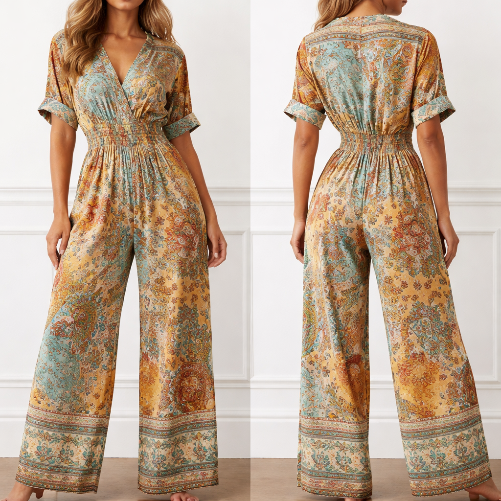 A cut together boho jumpsuit with a turn up sleeve,waist length v-neck,snatched waist with an elastic band
