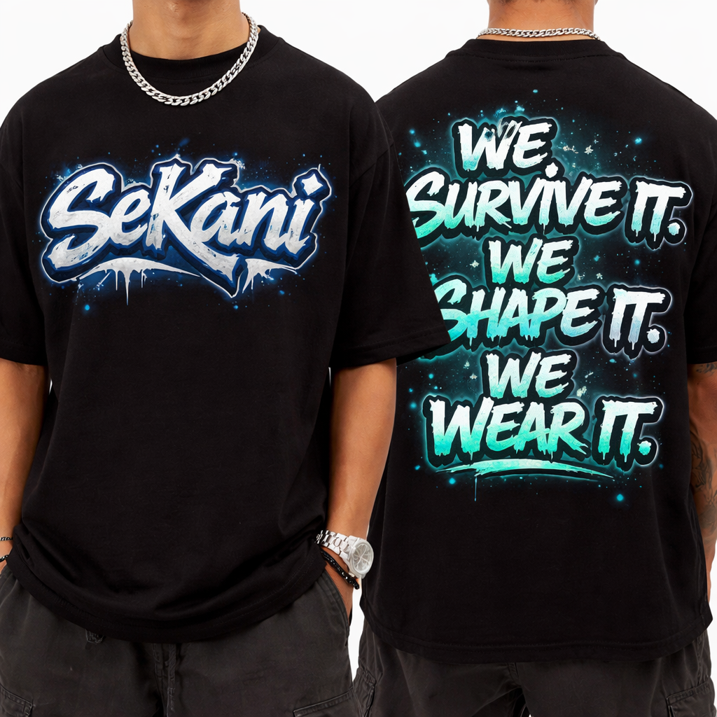 SeKani written on the front across the chest On the back my slogan will read “We Survive It. We Shape It. We Wear It.”, streetwear style, show front and back