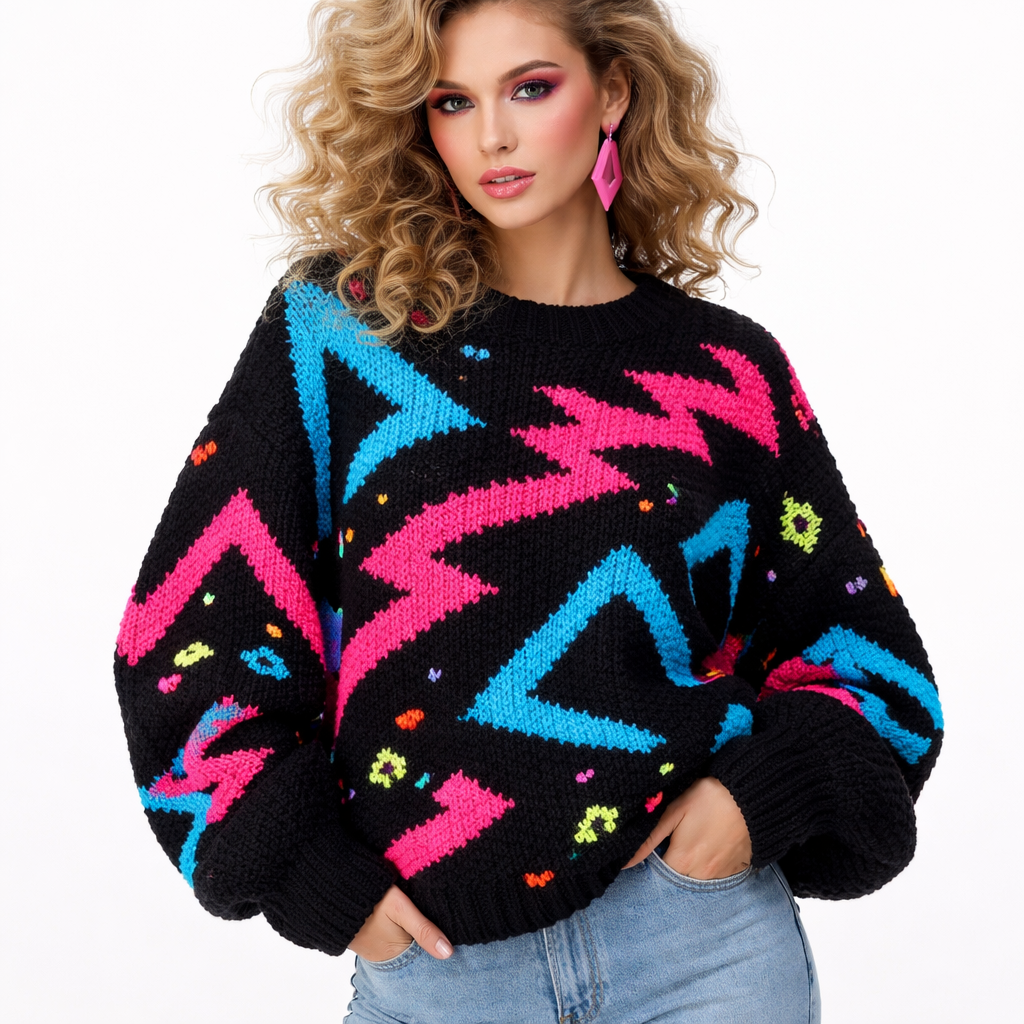 Eighties fashion design: Chunky knit sweater, oversized fit, neon geometric patterns in bright pink and electric blue on black cotton.