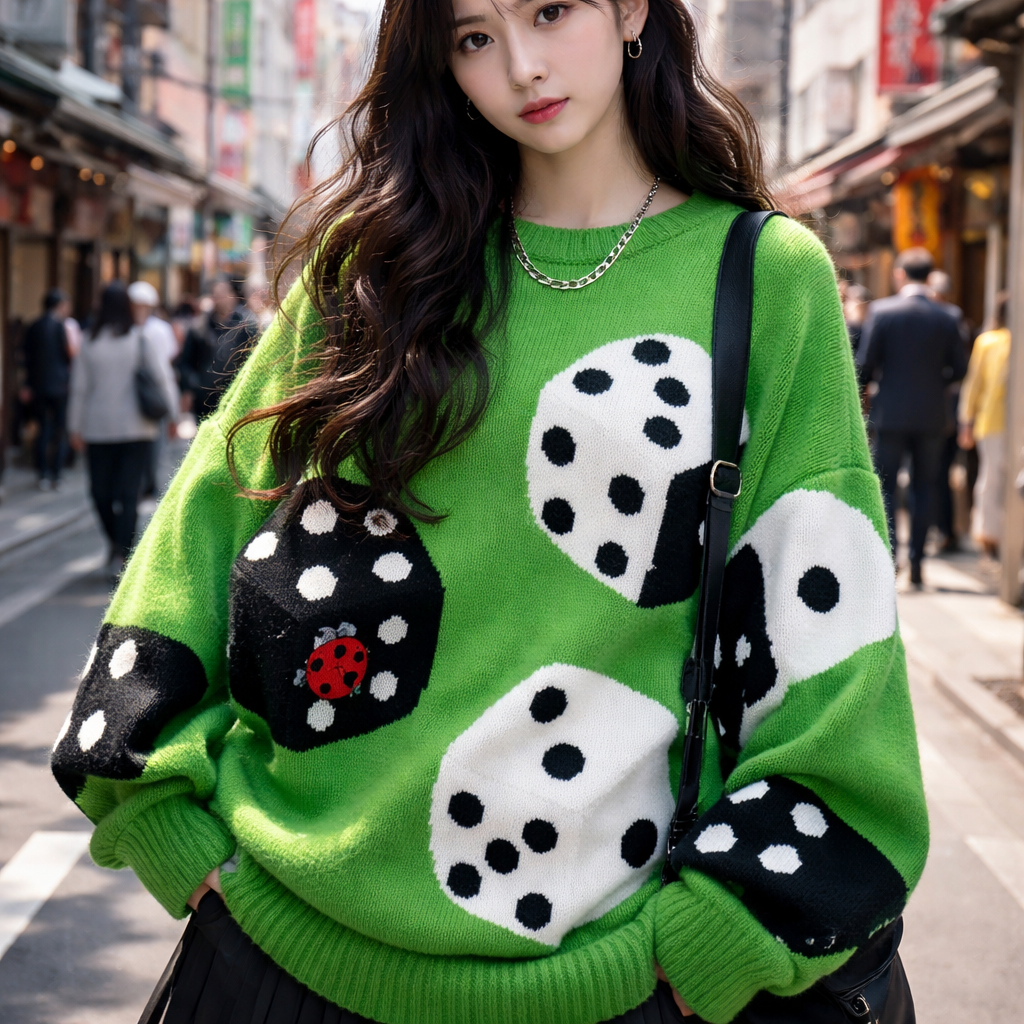 Japanese Street fashion design: A chunky green cotton sweater with oversized black and white dice. One die face has a small red ladybug. Loose fit, emphasizing comfort and playful urban style.