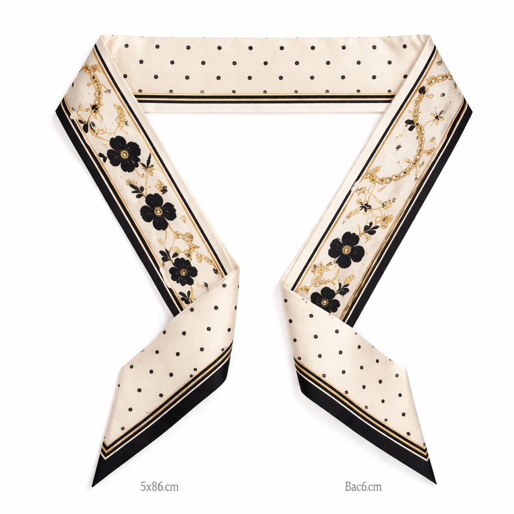 Design a scarf that is 5x86cm to be wrapped around the handle of a handbag for a lifestyle piece. No logos or words Something that is simple elegant and Audrey Hepburn style, classic style, show front and back