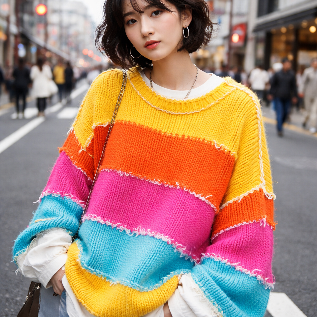 Japanese Street fashion design: Oversized fit, drop shoulder bright yellow, dark orange, hot pink and aqua striped chunky knit sweater. Raw edge details, visible stitching. Layered over a long sleeve tee.
