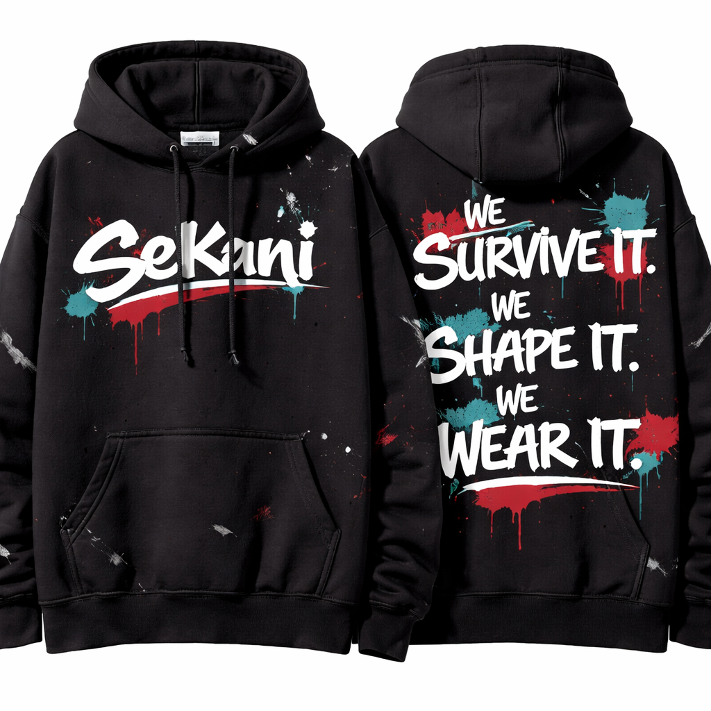 SeKani written on the front across the chest On the back my slogan will read “We Survive It. We Shape It. We Wear It.”, streetwear style, show front and back