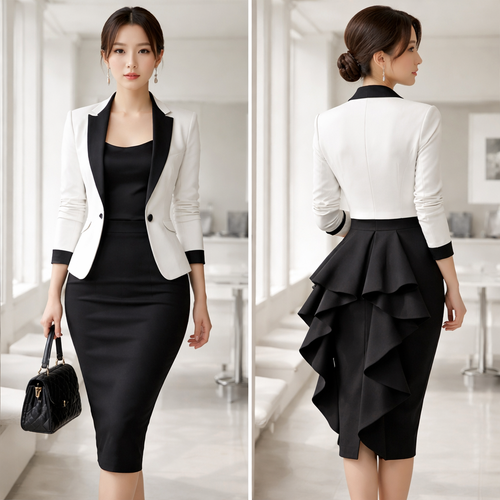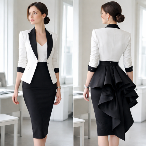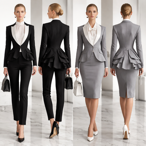 Real clothes, modern, office wear, bustle, black, white, gray, pantsuit, blouse, pencil skirt, power jacket.