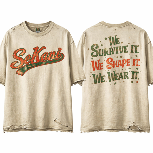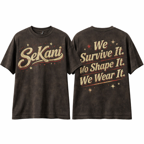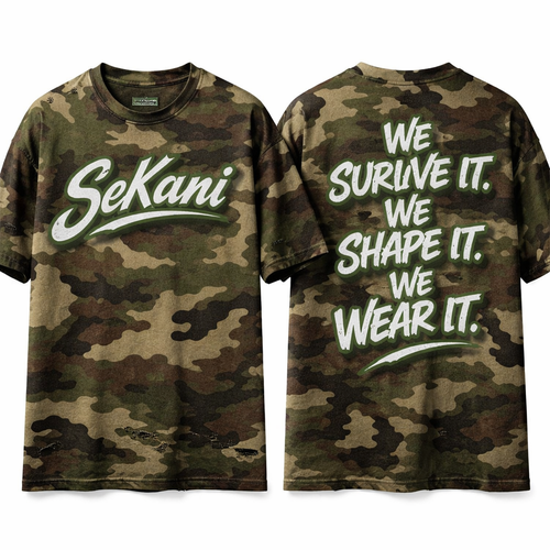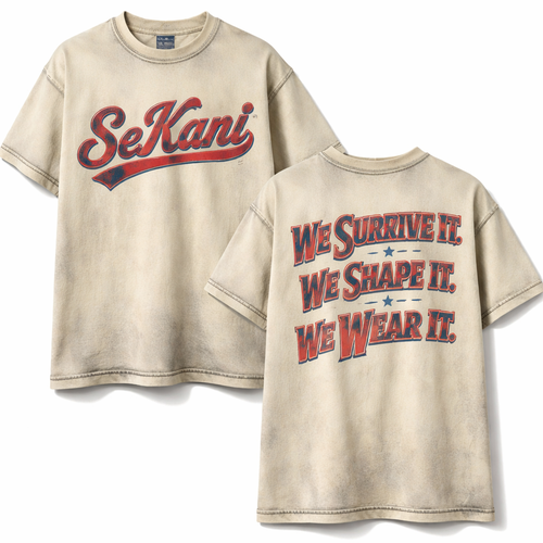 SeKani written on the front across the chest On the back my slogan will read “We Survive It. We Shape It. We Wear It.”