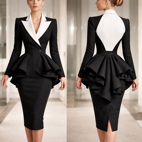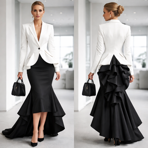 Real clothes, modern, office wear, bustle, black, white, gray, pantsuit, blouse, pencil skirt, power jacket