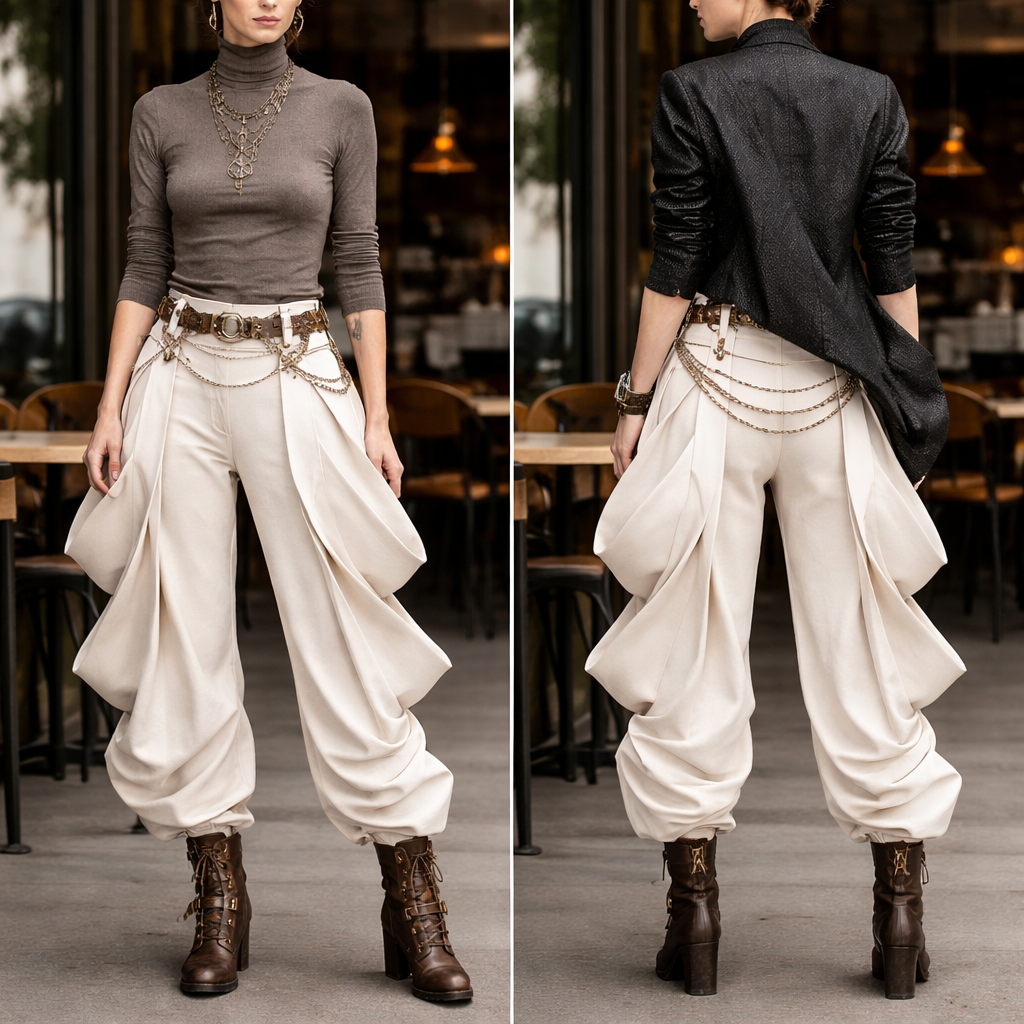 To create a pair of trousers for Tilda Swinton using the fabric manipulation technique shown in your images. They are to be casual, going out on a coffee date. follow these steps: ### Design Concept 1. **Silhouette Inspiration**: Consider Tilda Swinton's unique style, often characterized by avant-garde silhouettes. Incorporate a wide-leg or tapered design to reflect her fashion-forward attitude. 2. **Fabric Choice**: Select a lightweight fabric that holds shape well, like a structured cotton or a blend with some stretch. This will enhance the drape and allow for the manipulation technique. ### Pattern Development 1. **Base Trousers Pattern**: - Start with a basic trousers block pattern that fits well. Adjust the waist and hip measurements to ensure a comfortable fit. 3. **Finishing Touches**: - Construct the waistline and add any closures (like a zipper or buttons). - Hem the trousers to the desired length, allowing for a slight flare or taper at the bottom. ### Styling - Consider pairing the trousers with a fitted top or an oversized jacket to balance the proportions. - Accessories can include bold jewelry or unique footwear to complete the look. , steampunk style, show front and back