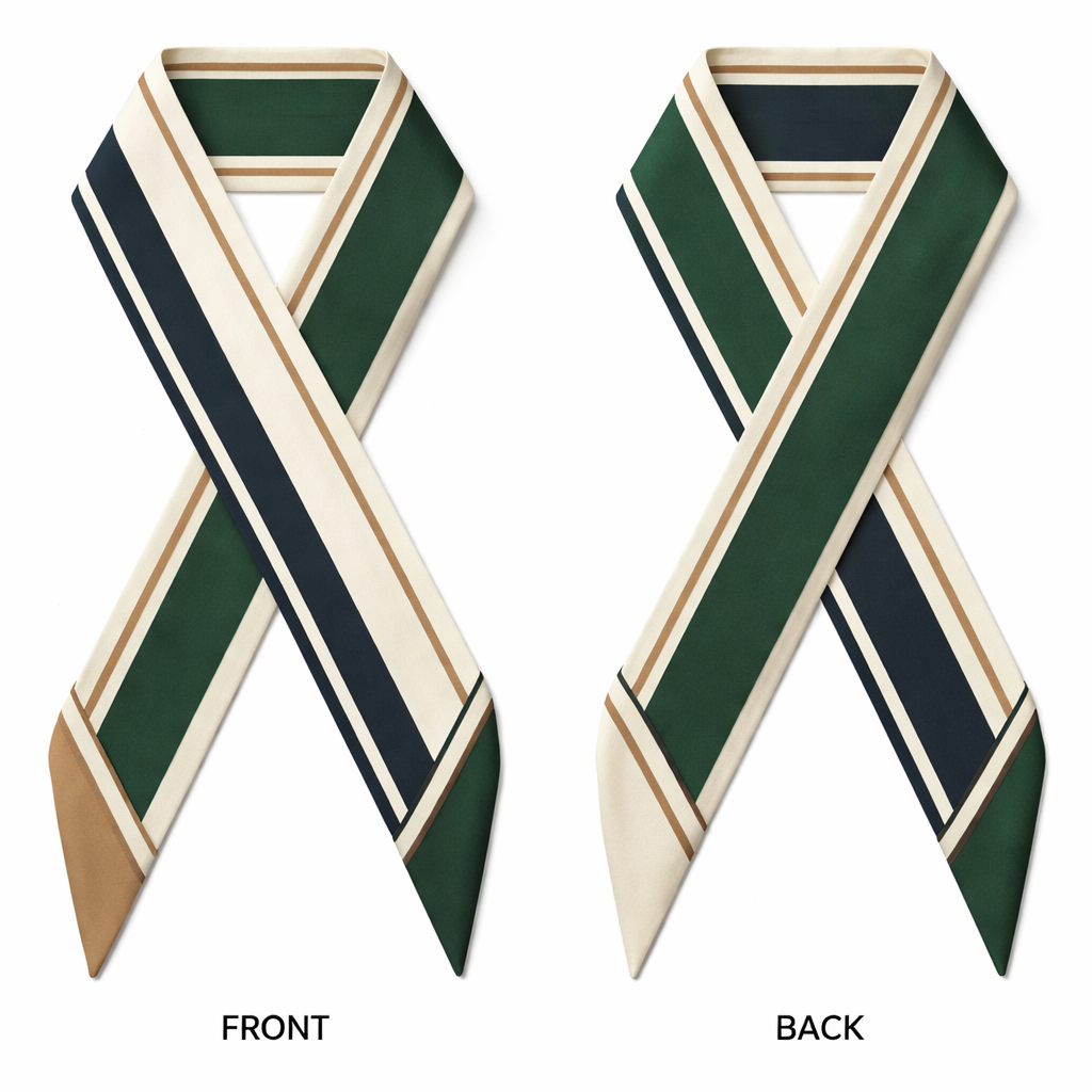 Design a silk twilly that is 5x 86 cm to be wrapped around the handle of a purse Make it iconic. Very Simple and tailored. No chains. Use classic old money color combinations , classic style, show front and back