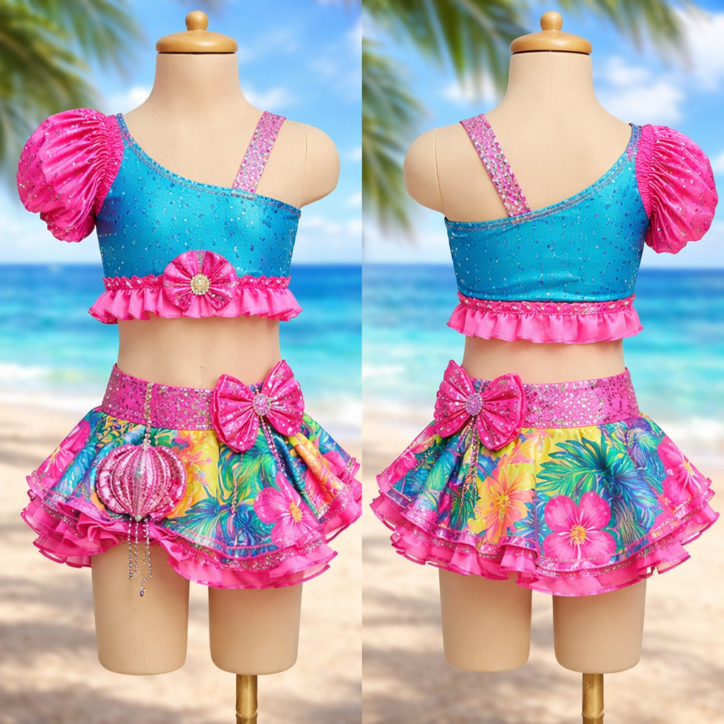 Tropical beach-themed girl’s dance costume made from Lycra. Top features one puff sleeve on one side and sequin strap on other. Small frill around waist with a centre bow with a sequin shell appliqué. High waist ra ra skirt with neon pink tropical flower print and pink shimmer trim with shell appliqué on hip