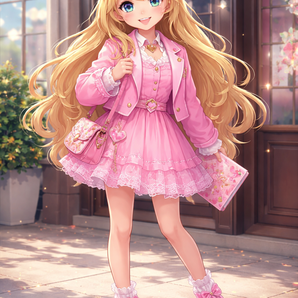 A Disney prince aroara 12 year old girl with a school look a pink dress with puffy sleeves pink heals gold crown gold crown and a pink blazer with a sleep mask pink , streetwear style