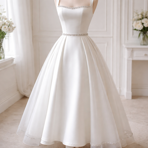 disegna un abito che sia senza spalline e che abbia una scollatura a cuore, attillato in vita e poi leggermente largo so...