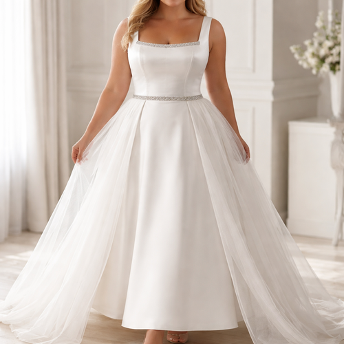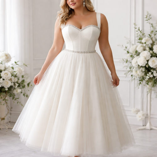Wedding style dress. Size 14 UK. Corset bodice, white, silk, studded with diamonds in a line along the top. Wide thick s...