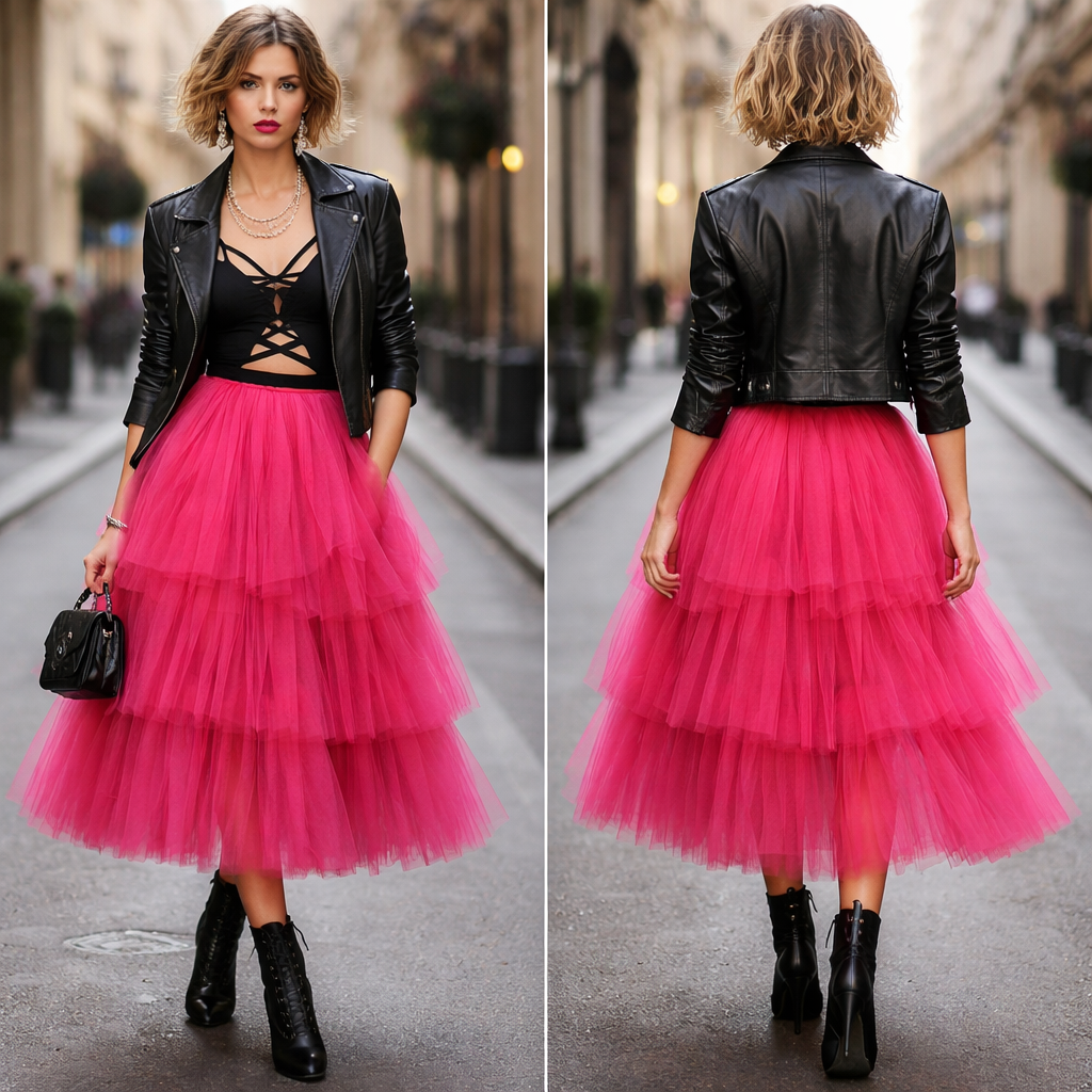 Create a sexy, modern yet super feminine ballet inspired look, with a vintage soft black leather jacket over a black silk top with interesting cut outs and a hot pink heavily layered tulle midi skirt. The look is completed by amazing black boots and pearl jewellery. The model wears a tousled highlighted bob and bold pink lips., classic style, show front and back