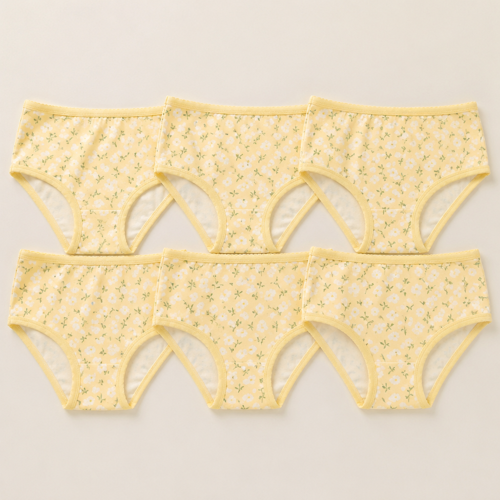 A Female Dress design, suitable for Spring, in Classic style. 6 pack seamless kids underwear. Yellow with white flowers. Ultra soft, minimal irritation.. Sweden fashion aesthetics.
