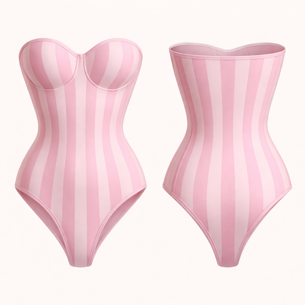 Bodysuit shape wear g string no ai model strapless no lines just no bow just string and no back open no ruffles ric rac pink and light pink stripes