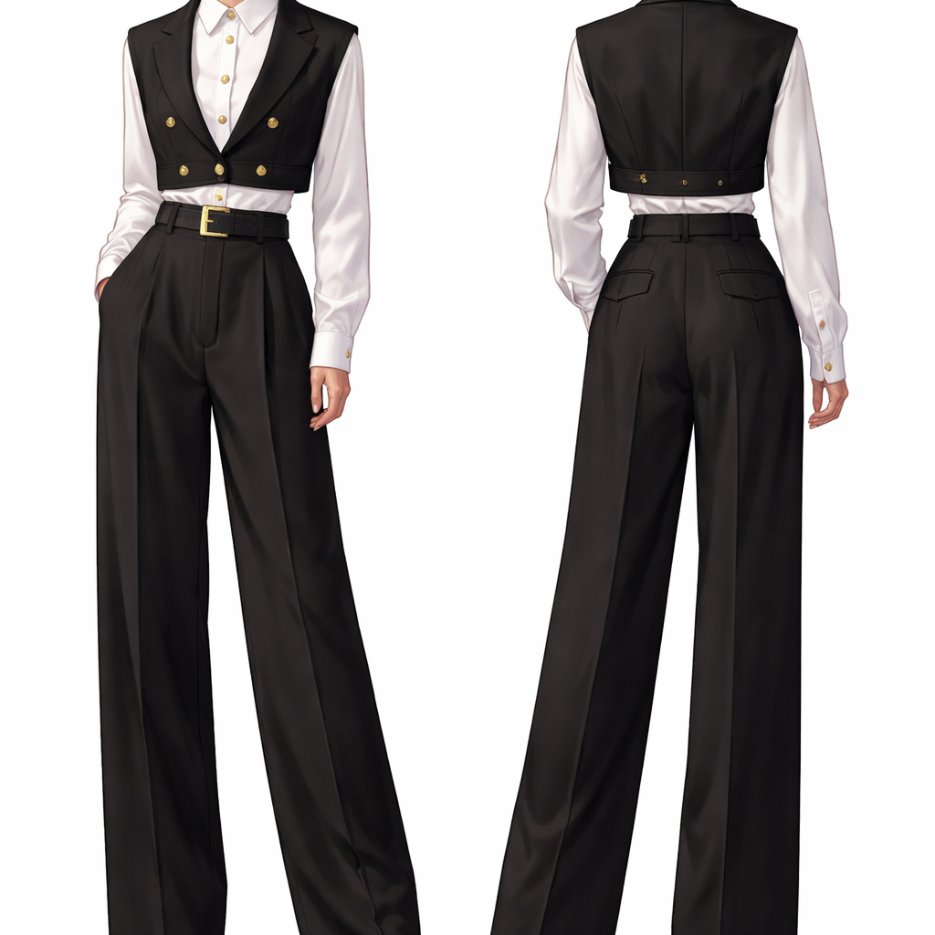 don’t draw the face but the fabric should be of that of a suit a baggy black trouser , paired with a white shirt long sleeve and a half vest blazer with golden buttons on top the blazer is also black add a belt too make the white shirt have gold buttons too, show front and back