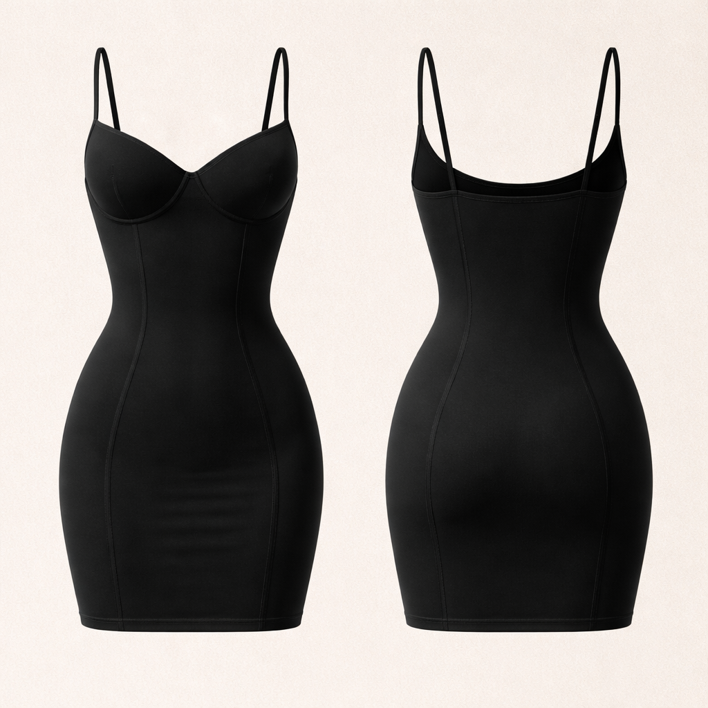 shape wear short black dress spaghetti straps , minimalist style, show front and back