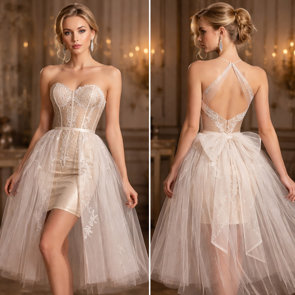 White cocktails dress, Sheer overlay, cut out back and structured underlament , built corset