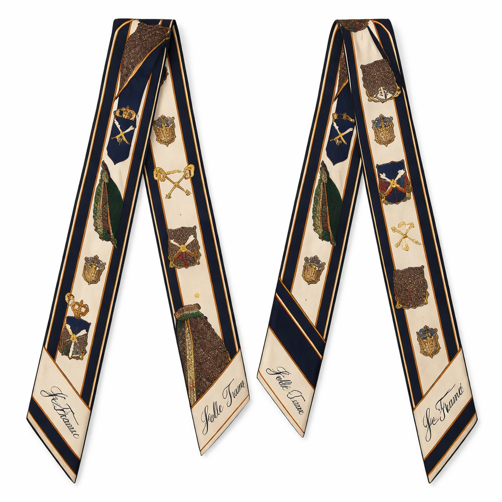 Design a 5x 86 cm silk scarf meant to be wrapped on the handle of a Kelly style bag. It needs to be very simple, tailored and classic. Make it a feminine version of J. Press. Add my brand name Jolie Franc in cursive . Make it British tailoring